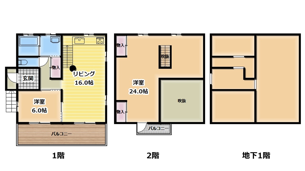 1F間取り 洋室6帖、LDK16帖 2階間取り 洋室24帖